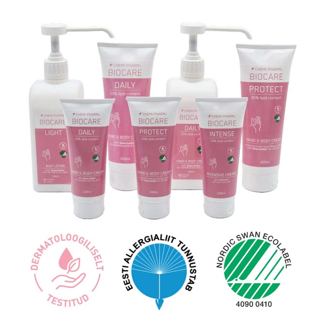 - Käte- ja kehakreemide sarjast 4 ökomärgisega ja Eesti Allergialiidu tunnustusega tundlikule nahale mõeldud kreemi Biocare Light 15%, Biocare Daily 25%, Biocare Protect 35% ja Biocare Intense 70% rasvasisaldusega kreemi.