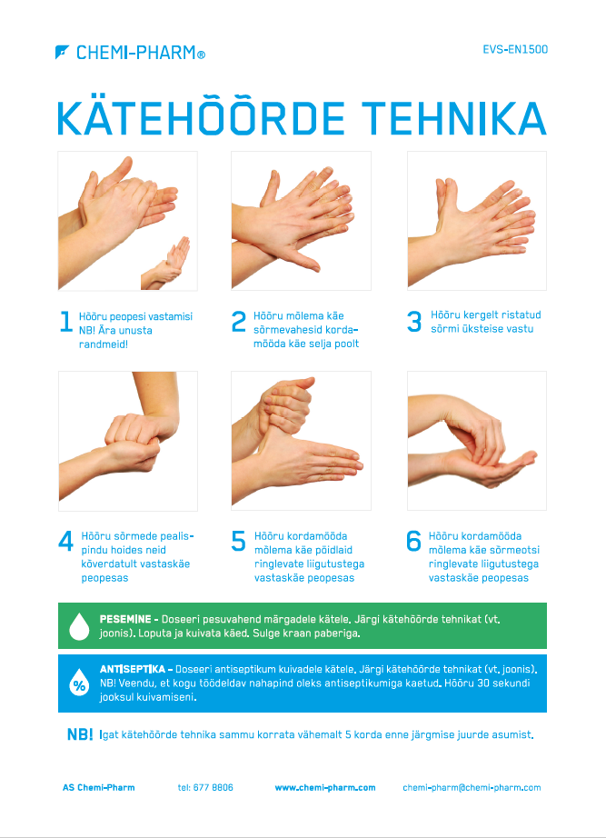 | Igal aastal rõhutab Maailma Tervisehoiuorganisatsioon kampaania „PÄÄSTA ELUSID: Pese käsi” käte desinfitseerimise olulisust nakkuste ennetamisel ning tervise kaitsmisel. Õige kätehügieen on lihtne, kuid võimas viis riske vähendada ja toetada ülemaailmseid tervisealaseid eesmärke, sealhulgas juurdepääsu ohutumale ja kvaliteetsemale tervishoiule. Korralik kätehügieen kodus, tööl või liikvel olles aitab hoida Sind ja Sind ümbritsevaid inimesi tervena. Meie lai valik käte desinfektsiooni- ja puhastusvahendeid teeb igapäevase hügieeni tagamise lihtsaks ja tõhusaks. Ainult täna on veebipoes selle päeva tähistamiseks kõik kätehügieeniga seotud tooted koguni -40% soodustusega! Avasta tõhusad lahendused puhaste käte säilitamiseks ning aita kaasa tervislikuma maailma loomisele! Kas teadsid, et õige kätehõõrdetehnikaga seebi kasutamine ennetab kuni 50% välditavatest infektsioonidest, mis tekivad tervisehoiuteenuse osutamisel? Oleme loonud kätehõõrde tehnika, mis vastab EVS-EN1500 standardile ning tagab efektiivse käte puhastuse Lae alla A4 kätehõõrde tehnika juhend Kätehügieen – see on pesemine, antiseptika ja nahahooldus. Seepärast on ainult täna PESEMISE, ANTISEPTIKA ja NAHAHOOLDUSE valitud tooted -40% soodsamad! Vision kätepesuseep 1 liiter Apelsinilõhnaline kreemalusel nahassõbralik vedelseep, mida võib kasutada ka kogu keha ja juuste pesemiseks. 3,09 € Chemisept Hand Des antiseptikum 500 ml Efektiivne antiseptikum sisaldab komponente, millel on nahka pehmendav, niisutav ja kaitsev toime. Kasutage antisepikumi ohutult! Enne kasutamist lugege lisatud teave alati läbi! 5,03 € Biocare Protect 35% 200 ml Niisutav kreem kuivale ja tundikule nahale. Sheavõis sisalduvad vitamiinid A ja E toidavad, niisutavad ja pehmendavad nahka. Tunnustatud Eesti Allergialiidu poolt, dermatoloogiliselt testitud ning sertifitseeritud Põhjamaade Luigemärgisega. 4,50 € |